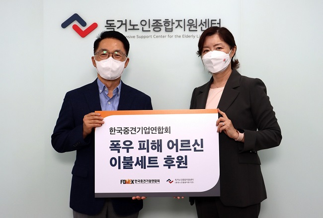 중견련은 30일 보건복지부 위탁 독거노인종합지원센터에 폭우 피해 어르신 지원을 위한 수재의연금 천만 원을 기탁했습니다. 기탁금은 서울 폭우 피해 지역 어르신 180분에게 전달할 이불세트를 구매하는 데 쓰일 예정입니다.