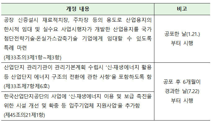 1월 21일 산업통상자원부는 산업단지에서 산업용지 임대 특례제도 신설, 신·재생에너지 도입 지원을 주요 내용으로 하는 ‘산업집적활성화 및 공장설립에 관한 법률’ 개정법률안이 1월 21일 공포되어 시행된다고 밝혔습니다.
