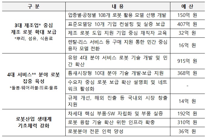제3차 지능형 로봇 기본 계획의 주요 추진 과제인 3대 제조업 중심 제조 로봇 보급, 4대 서비스 로봇 분야 집중 육성, 로봇 산업 생태계 기초 체력 강화 이행을 위한 세부 계획이 담겼습니다.