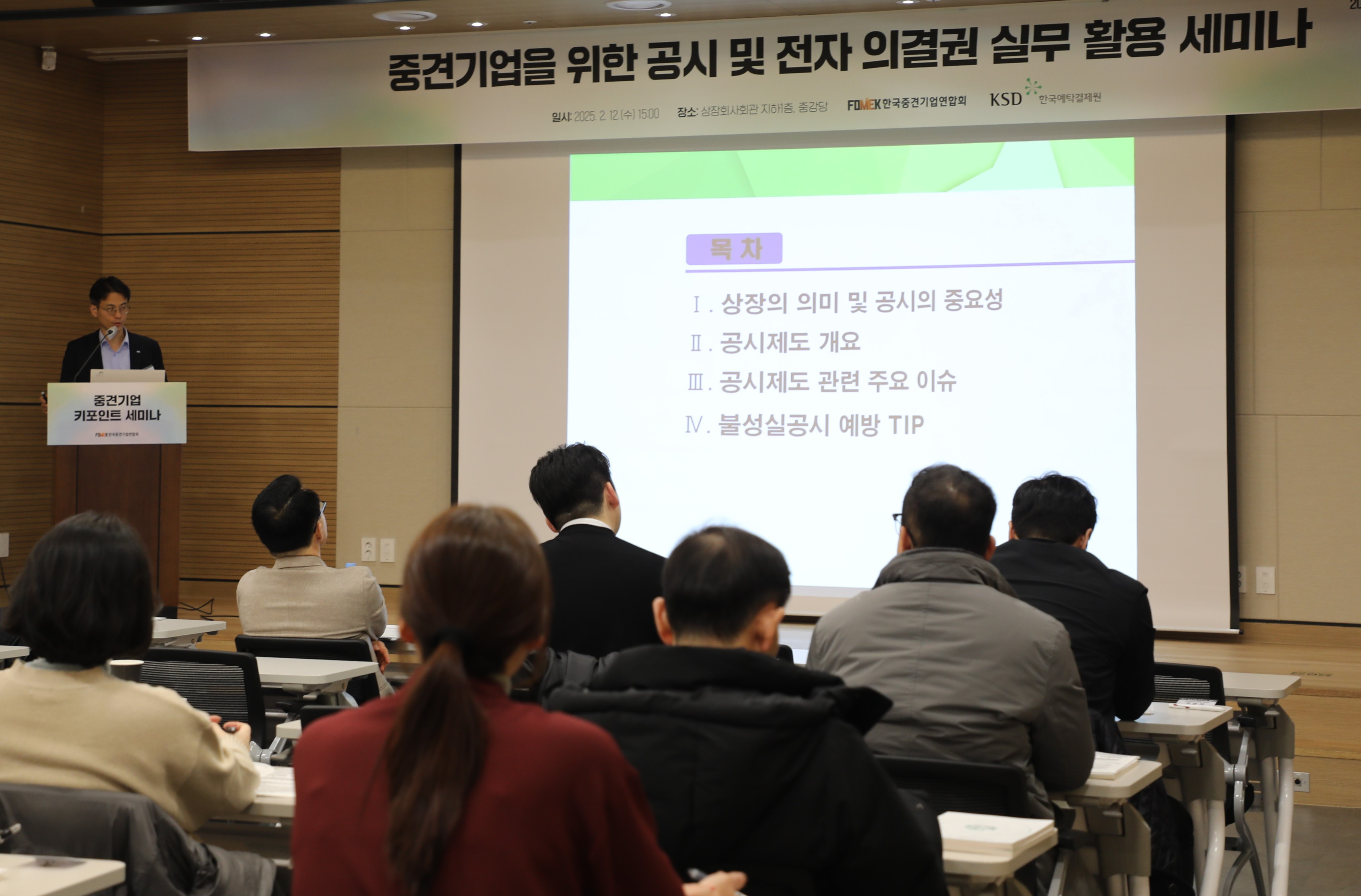 한국예탁결제원과 협력해 진행한 이번 세미나는 중견기업의 지속가능한 성장과 효율적인 지배구자 관리를 지원하기 위해 전자적 의결권 행사 및 공시 제도를 안내했습니다.