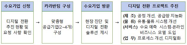 - 내 용: 국내 대표 IT 공급기업 전문가로 구성된 ‘카라반’이 수요기업을 직접 방문해 디지털 전환 애로를 최소화할 수 있는 디지털 기술 및 솔루션 도입 전략 패키지 제안