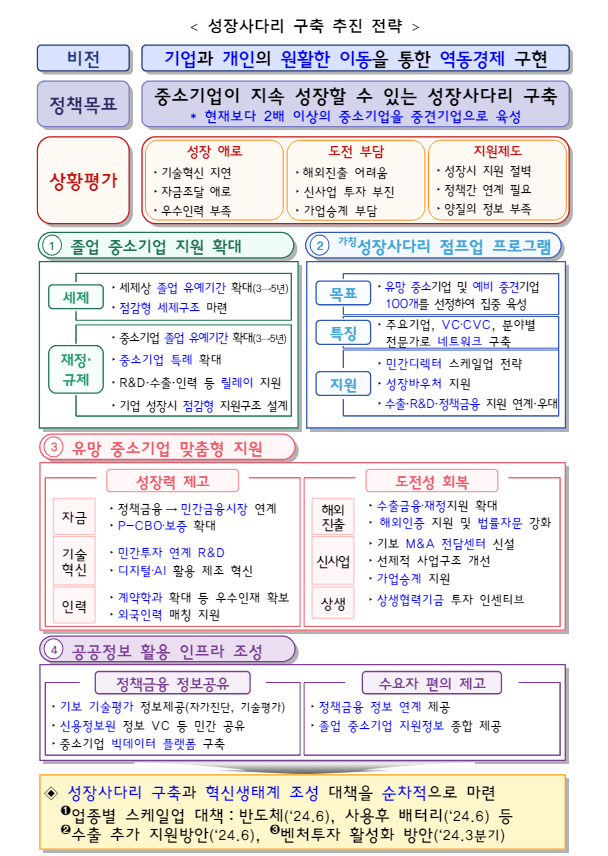 중소기업 기준을 넘어도 세제혜택을 유지하는 유예기간을 5년(현행 3년)으로 확대, 100대 유망 중소기업 선정 3년간 지원하는 ‘성장사다리 점프업 프로그램’ 신설, 11조원 중견기업 금융 프로그램 연계 등의 내용을 담았습니다.