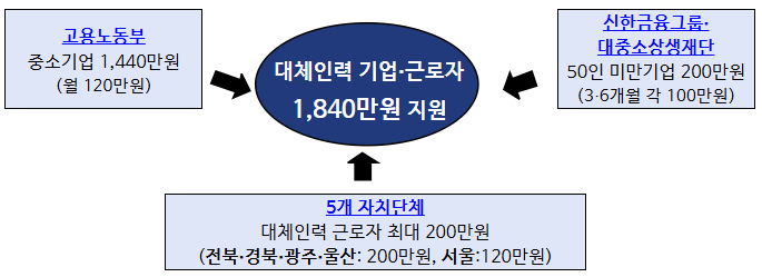 1월 2일 고용노동부는 신한금융그룹, 대·중소기업·농어업협력재단, 5개 자치단체*와 대체인력 1인당 연간 최대 1,840만 원을 지원한다고 밝혔습니다.