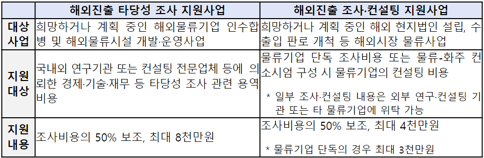 우리나라 해운·물류기업의 신규 해외 물류시장 진출에 필요한 타당성 조사 또는 컨설팅 비용을 지원하는 사업입니다.