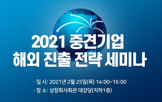 한국중견기업연합회가 25일 서울 마포 상장회사회관에서 '2021 중견기업 해외 진출 전략 세미나'를 개최하고, 코로나19 팬데믹 이후 글로벌 통상 환경 변화에 대응하기 위한 부문별 핵심 전략을 모색합니다.