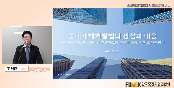 조서경 김앤장 법률사무소 변호사는 특강에서 중대재해처벌법 관련 최근 동향, 적용 범위, '경영책임자'의 범위 및 안전 보건 확보 의무, 중대재해 종류, 산업안전보건법과의 관계 등을 설명하고, 중대산업재해, 중대시민재해 등을 중심으로 중견기업의 대응 전략을 제시했습니다.