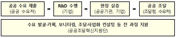 공공기관의 수요를 기반으로 중견·중소기업의 기술 개발을 돕고, 조달청 우수조달물품*으로 지정해 공공기관이 수의계약을 통해 구매할 수 있도록 지원하는 사업입니다.