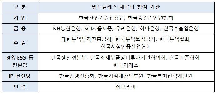 한국중견기업연합회, 한국산업기술진흥원, 대한무역투자진흥공사 등 19개 유관기관과 금융, 수출, 경영 및 IP 컨설팅 등 분야별 지원 기관은 체계적인 협력을 위한 '월드클래스 셰르파 업무협약'을 체결했습니다.