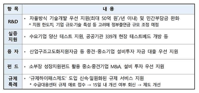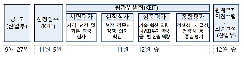 100대 핵심전략기술 분야에서 글로벌 경쟁력을 갖춘 소부장 대표기업을 육성하기 위해 5년간 최대 연 50억 원 규모 이내 R&D, 양산 테스트 등을 지원합니다.