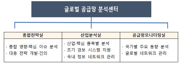 코로나19 팬데믹, 탄소중립, 러시아-우크라이나 갈등 등 공급망 리스크가 심화되는 상황에서 주요 품목·지역·국가별 위기 징후 등 글로벌 공급망 이슈를 분석하고 대응 전략을 모색, 정부와 기업이 선제적으로 대응할 수 있도록 지원하기 위해 신설됐습니다.